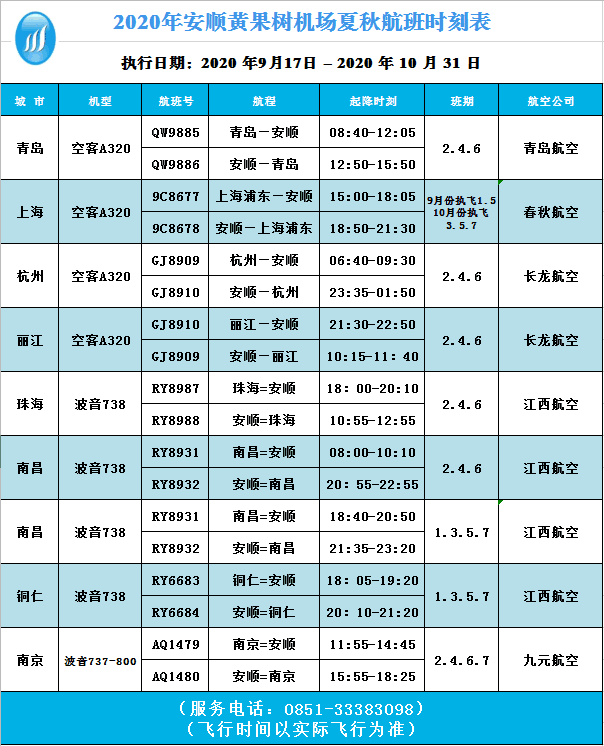 2020年安顺黄果树机场夏秋航班时刻表